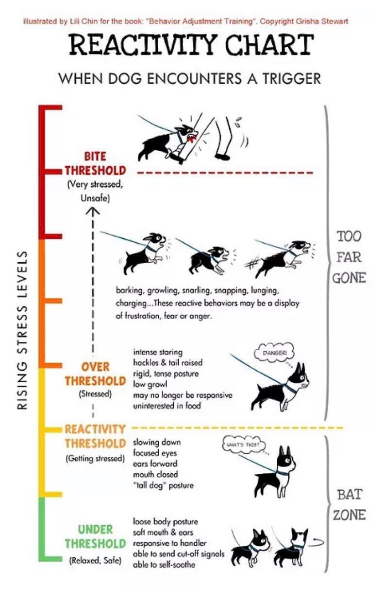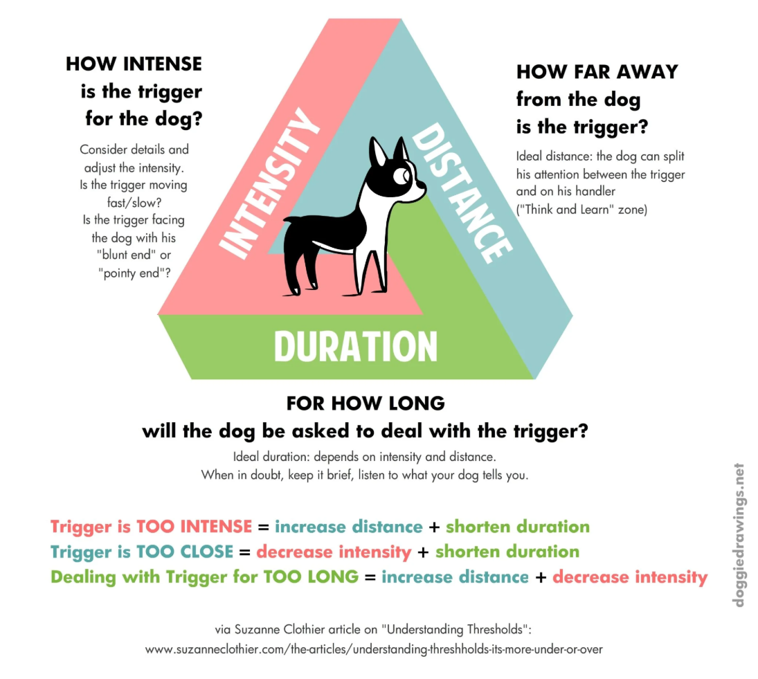 If there is one factor that determines whether LAT will work or not, it’s threshold. Threshold is the point at which your dog becomes too overwhelmed to learn. It’s not just barking and lunging, it can also look like intense staring, stiff body language, or refusing food. Three main variables influence this: how far away the trigger is, how long your dog is exposed to it, and how intense that trigger is. When a dog is under threshold, they can notice the trigger and still process information. This is where learning happens. When they are over threshold, they are in survival mode. At that point, no amount of training is going to be effective, the only goal is to create distance and help them recover. This is why LAT often looks very “easy” in theory but feels much harder in real life. It requires careful setup, good observation, and sometimes starting much further away than people expect.